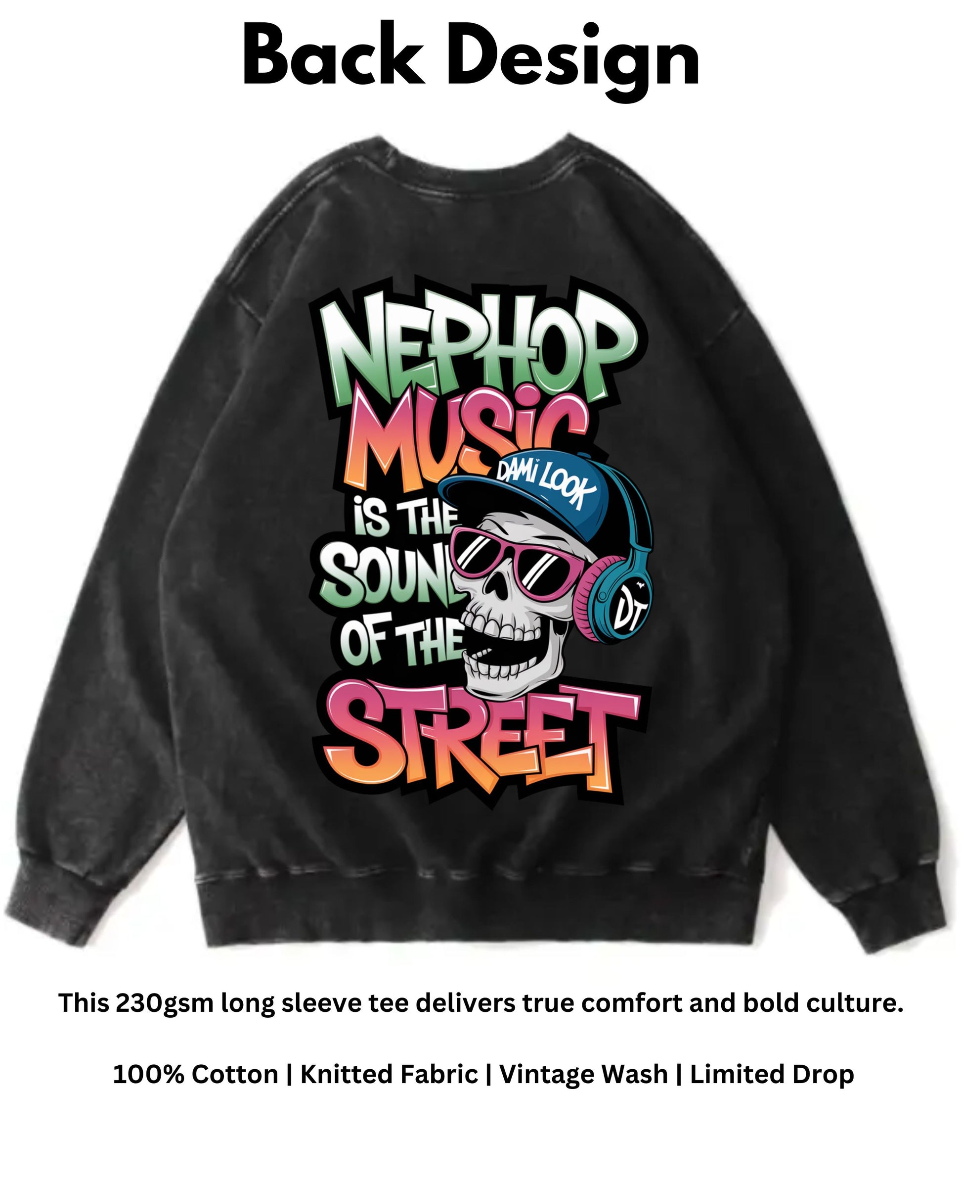 “Nephop Music is the Sound of HipHop” – loud, raw, and real. This long-sleeve oversized tee is for the true fans of Nepali HipHop culture. With a bold skull wearing headphones graphic and powerful slogan on the back, it’s more than fashion—it’s a voice.