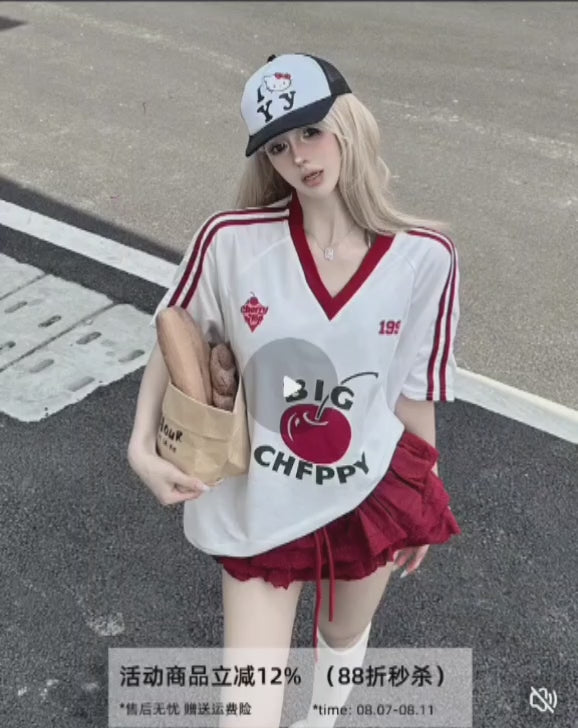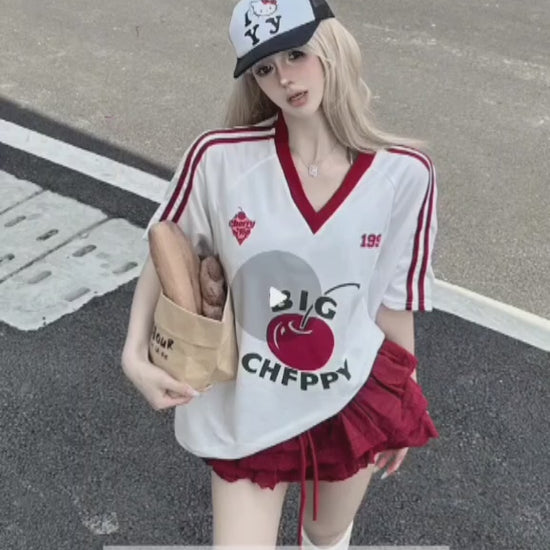 American college style T-shirt women's summer new fruit print v-neck jersey short-sleeved loose casual sports top trend