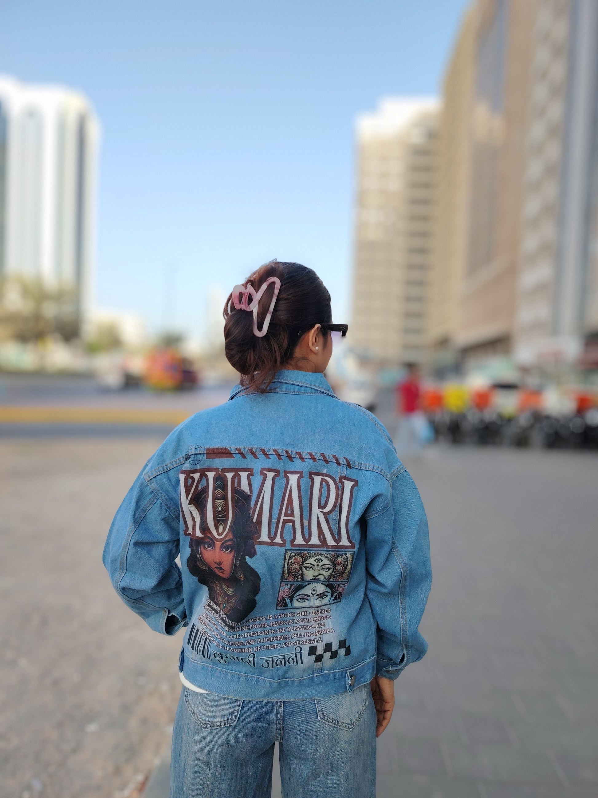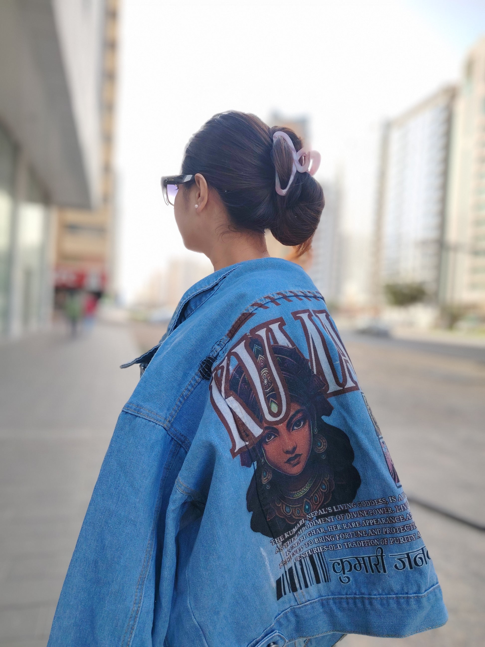 Embrace the strength and grace of Nepal's most sacred tradition with our "Kumari" print jeans. More than just fashion, this design is a tribute to the young Living Goddess of Kathmandu, a symbol of purity and protection for centuries.